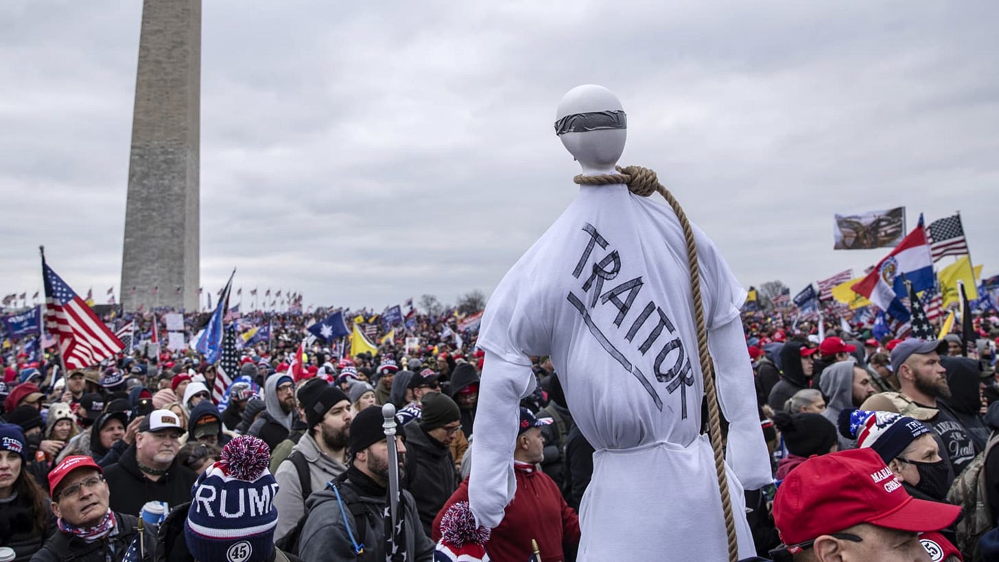 Let us remember it was less than a month ago that our nation’s Capital was infiltrated by traitorous thugs, insurrectionists who killed a policeman, who gleefully toted a mini-gallows, who openly threatened the Vice President of the United States and the Speaker of the House with death. All fired up by the president, who whipped up their anger and set them on the path to the Capital building, then slunk off to watch the results on TV at a safe distance from the very rabble he minutes earlier pledged to join.